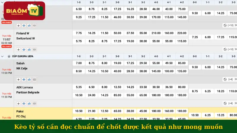 Tỷ số chính xác thuộc dạng kèo chính luôn có trong mọi trận đấu nên mang tới vô vàn gợi ý thú vị để vào tiền. Biaomtv sẽ đưa ra dự đoán chi tiết về các trường hợp xảy ra với kết quả hiệp 1 hoặc toàn trận đấu.
